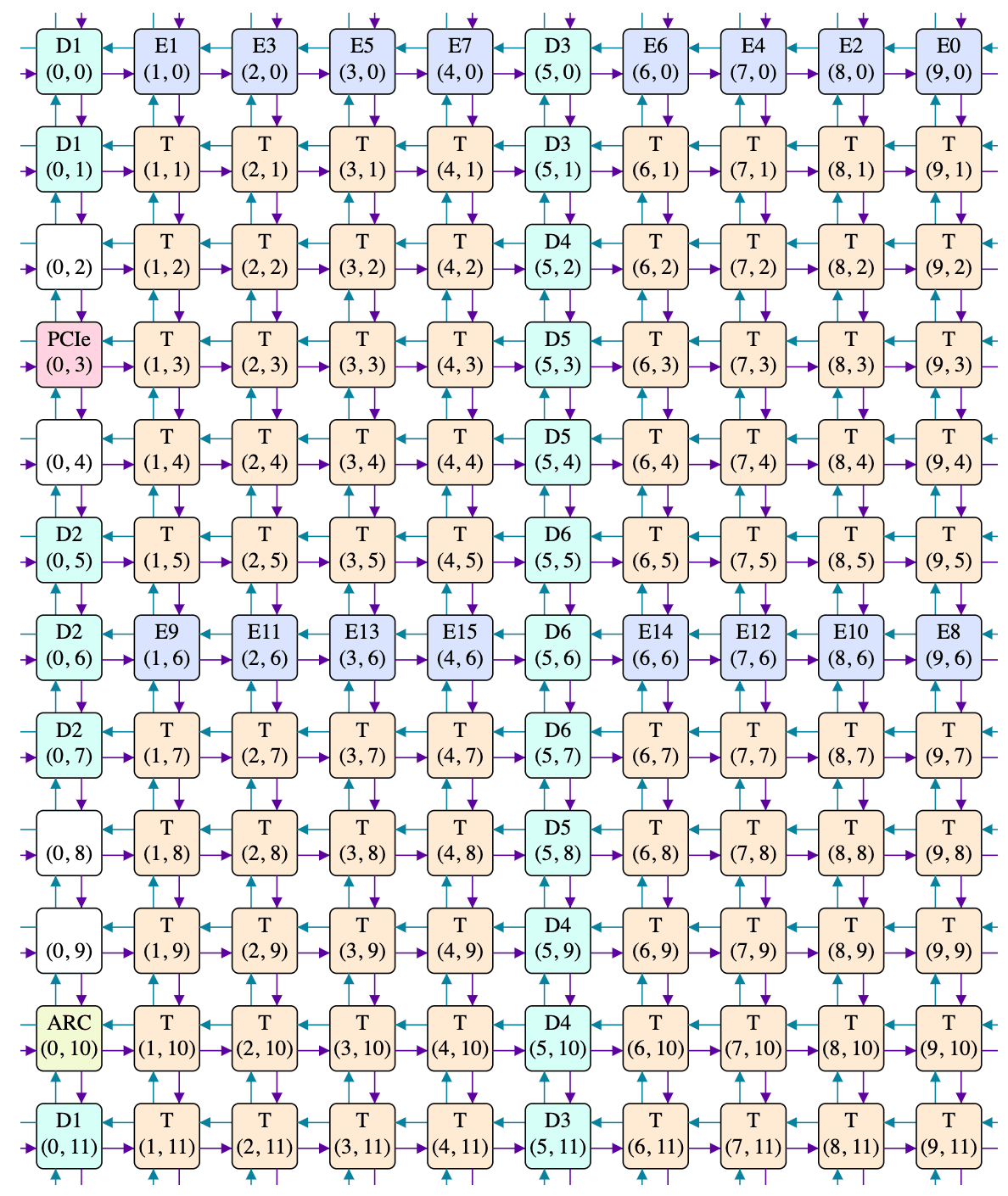 The various tile-to-tile connections aren't shown on the above, as it would be a horrible mess of overlapping and dodging lines. It does however match the circuit board photos: the DRAM tiles are on the left and right edges, and tiles routing to the same DRAM chip are adjacent (e.g. the three D5 tiles are physically adjacent, even though their logical Y coordinates are 3, 8, 4). The ethernet tiles also end up on the physical edges, which makes sense. Thankfully, software mostly doesn't need to worry about this interleaving (except for HARVESTING_NOC_LOCATIONS, which you'll note are the Y coordinates of an interleaved column of T tiles), and can instead stick to the original logical view: