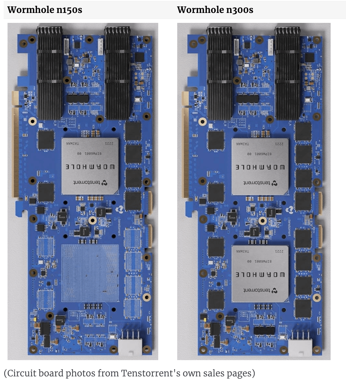 A company called Tenstorrent design and sell PCIe cards for AI acceleration. At the time of writing, they've recently started shipping their Wormhole n150s and Wormhole n300s cards. After taking the shell and the heatsinks off, the underlying circuit board looks like: