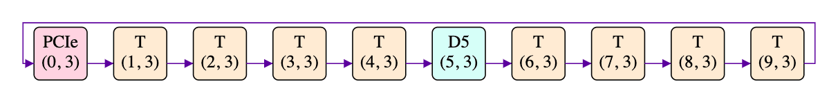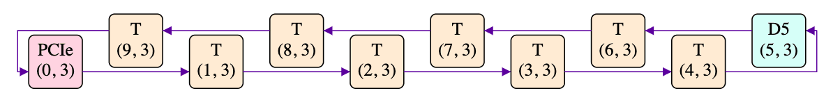 Each tile has four outbound connections to its (north/east/south/west) neighbours, along with four corresponding inbound connections from its neighbours, with each connection being 32 bytes wide (apparently upgraded to 64 bytes wide in the next-generation Blackhole ASIC). The combination of the east-bound and south-bound channels are called NoC (Network on Chip) #0, whilst the combination of the west-bound and north-bound channels are called NoC #1. Going eastward from the eastmost edge lands you on the westmost edge (e.g. going east from the T at (9, 3) gets you to PCIe at (0, 3)). A similar thing is true on the other three edges: they are each connected to the edge on the opposite side. Taking the eastbound connections in row 3 as an example, we have:
