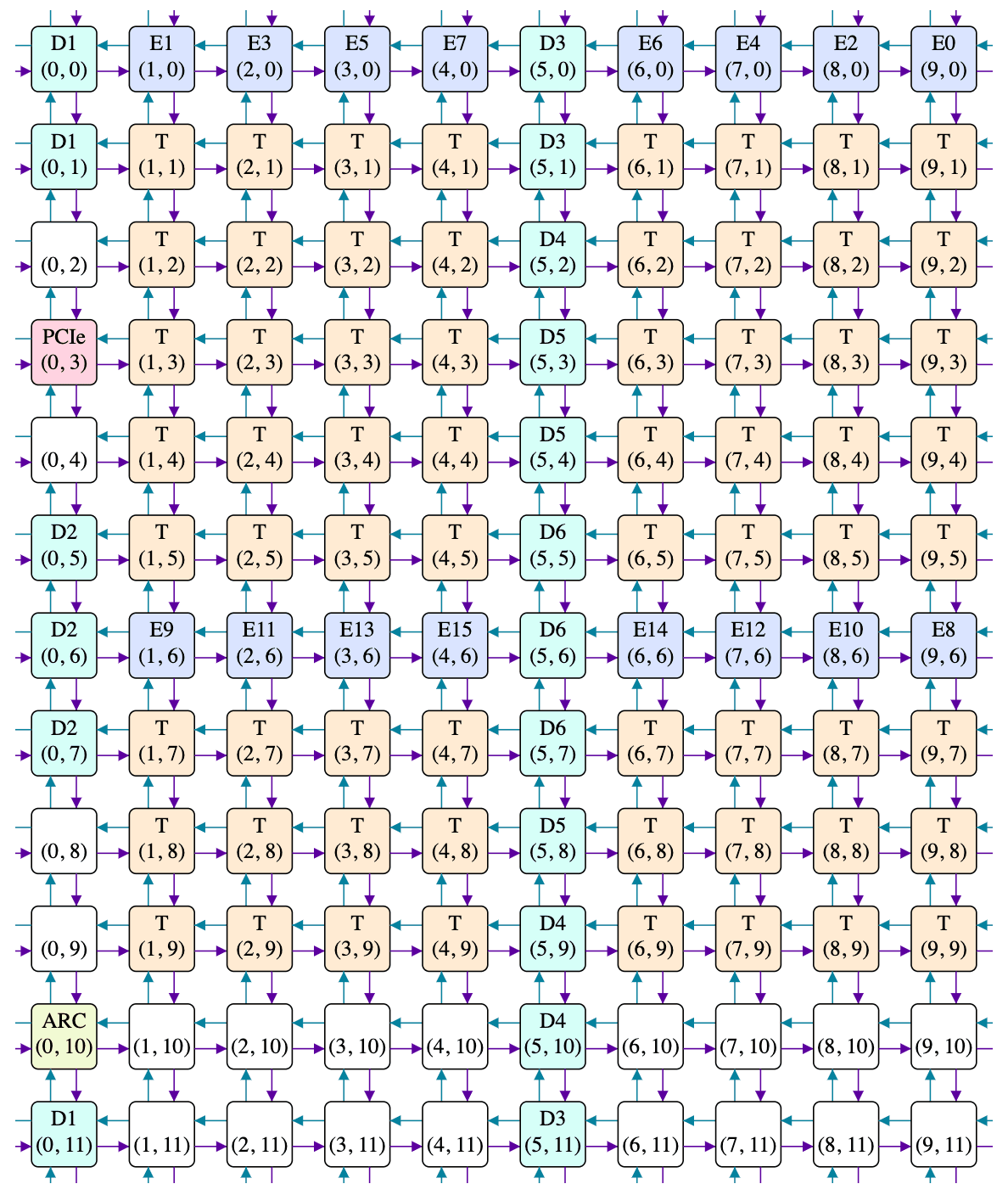 ASSERT(mmap(dev + BAR0_SIZE, MMAP_SIZE - BAR0_SIZE, PROT_READ | PROT_WRITE, MAP_SHARED | MAP_FIXED, fd, bar4uc->mapping_base + (BAR0_SIZE - BAR4_SOC_TARGET_ADDRESS)) != MAP_FAILED);This gives us a 512MB window for talking to the Wormhole ASIC, but what wonders does this window contain? It so happens that the 16MB from resource 2 contains an assortment of configuration registers on the ARC and PCIe tiles. Meanwhile, the remainder of the window maps to the PCIe tile, and any read/write performed by the host against this window gets translated into a NoC read/write by the PCIe tile. The details of that translation can be tweaked by using some configuration registers in the aforementioned resource 2. The general shape cannot be tweaked: the 496MB range subdivides into 156 pieces of size 1MB, 10 pieces of size 2MB, and 20 pieces of size 16MB. After that, things get tweakable: for each piece, we can specify the X/Y coordinates of the tile on the NoC to read/write (or the X/Y coordinates of a rectangular range of tiles for multicast writes), which 1MB/2MB/16MB-aligned range of address space within the tile to target, whether to use NoC #0 or #1, and a few other properties. The Tenstorrent software calls these pieces TLBs, which is not to be confused with the TLB used within a CPU to translate between virtual and physical addresses. Mapping the first 464MB of resource 0 as write-combining means that most of the pieces are write-combining; only the final two 16MB pieces fall within the uncacheable part (note that this WC/UC difference only affects whether the host buffers up writes before passing them along to the PCIe tile; once the PCIe tile receives the PCIe transaction, it doesn't care whether WC or UC was used to get there).